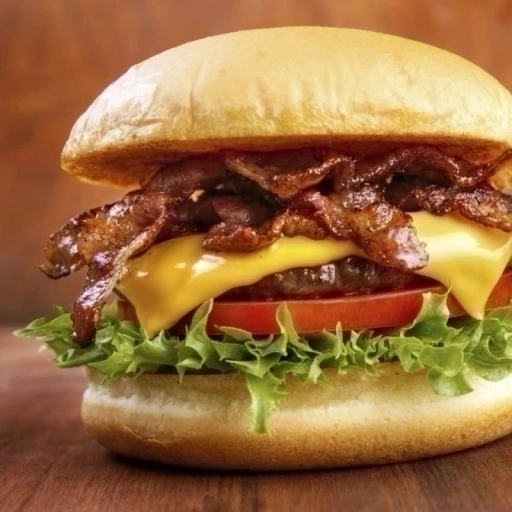 Pão bola, 3 hambuguer artesanal, queijo cheddar, bacon e salada