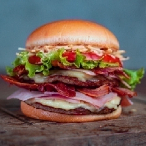 Pão bola, hambuguer artesanal, bacon, presunto mussarela e salada