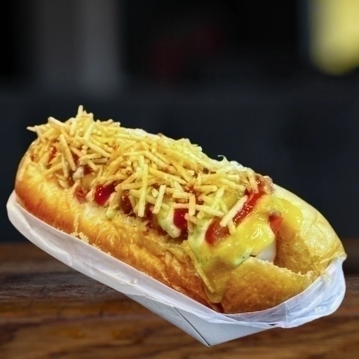 salsicha, frango ou carne moída, catupiry, tomate, milho, ervilha, batata palha e queijo ralado