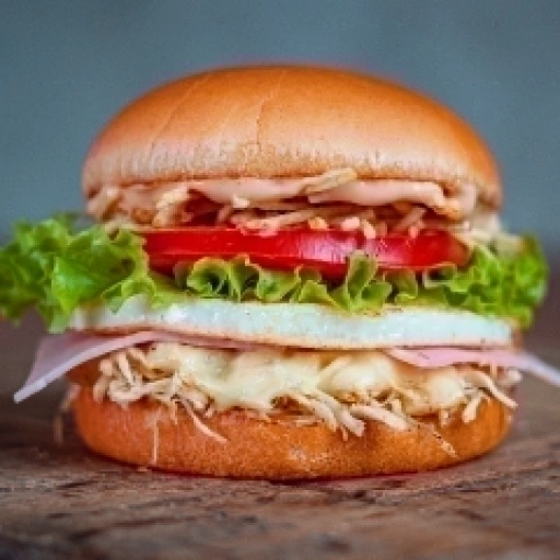 Pão bola, 2 hambuguer artesanal, frango. alcatra, bacon, ovo, presunto, mussarela e salada