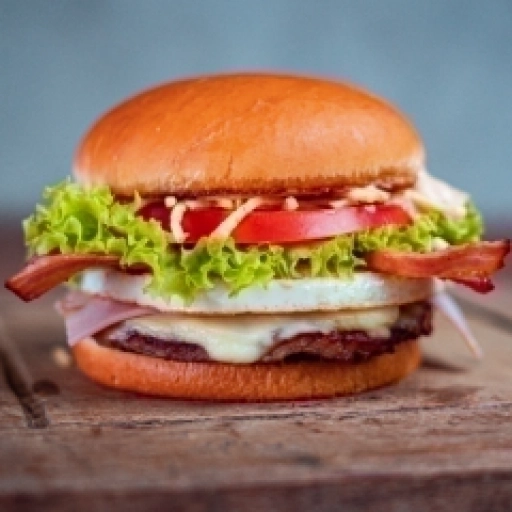 Pão bola, alcatra, bacon, presunto, mussarela, ovo e salada